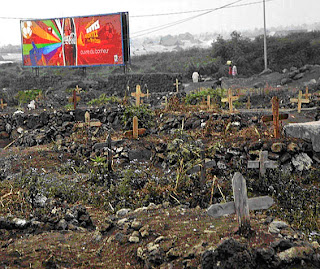 Las tumbas del cementerio de Goma, la capital del infierno congoleño durante largos diez años, miran hacia un gran anuncio de refresco. Puede que a los publicistas les pareciera oportuno que ante tanta muerte “un toque refrescante” siempre viene bien. O quizás piensan que, como el Congo tiene casi 5 millones de muertos que esperan ser enterrados, que por porcentaje seguro que mucha gente pasa por el sacrosanto lugar y verá la publicidad. Tal vez hayan creído que justo donde se asientan las flamantes letras rojas que incitan a la felicidad sea el perfecto lugar para venderse, lo que no saben es que debajo están las fosas del cólera. Pero no hay que escamarse ¡no! El Congo tiene muchas fosas para elegir donde hacer publicidad, de hecho creo que casi ningún pedazo de tierra entre la frontera del antiguo Zaire y Ruanda está libre de tener muertos sin identificar debajo.